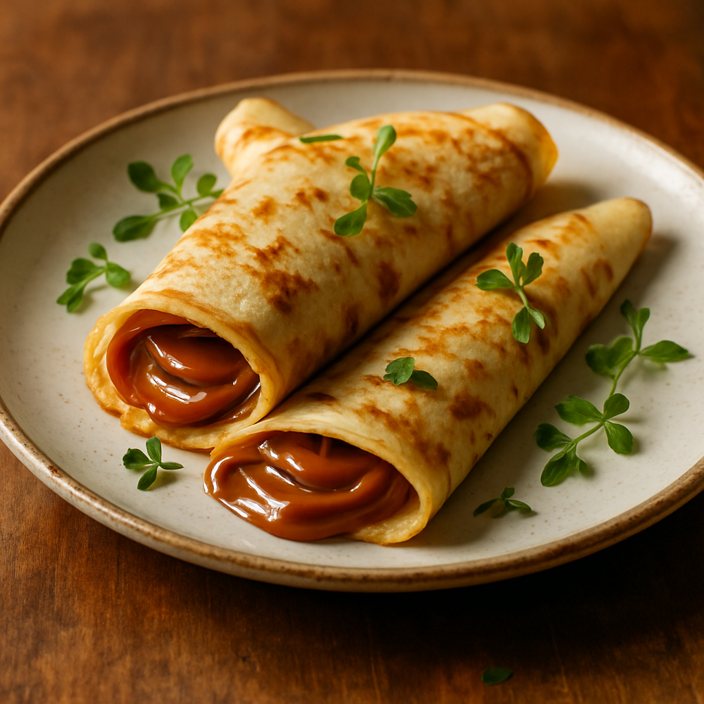 Deliciosos y esponjosos panqueques servidos con un generoso relleno de dulce de leche.